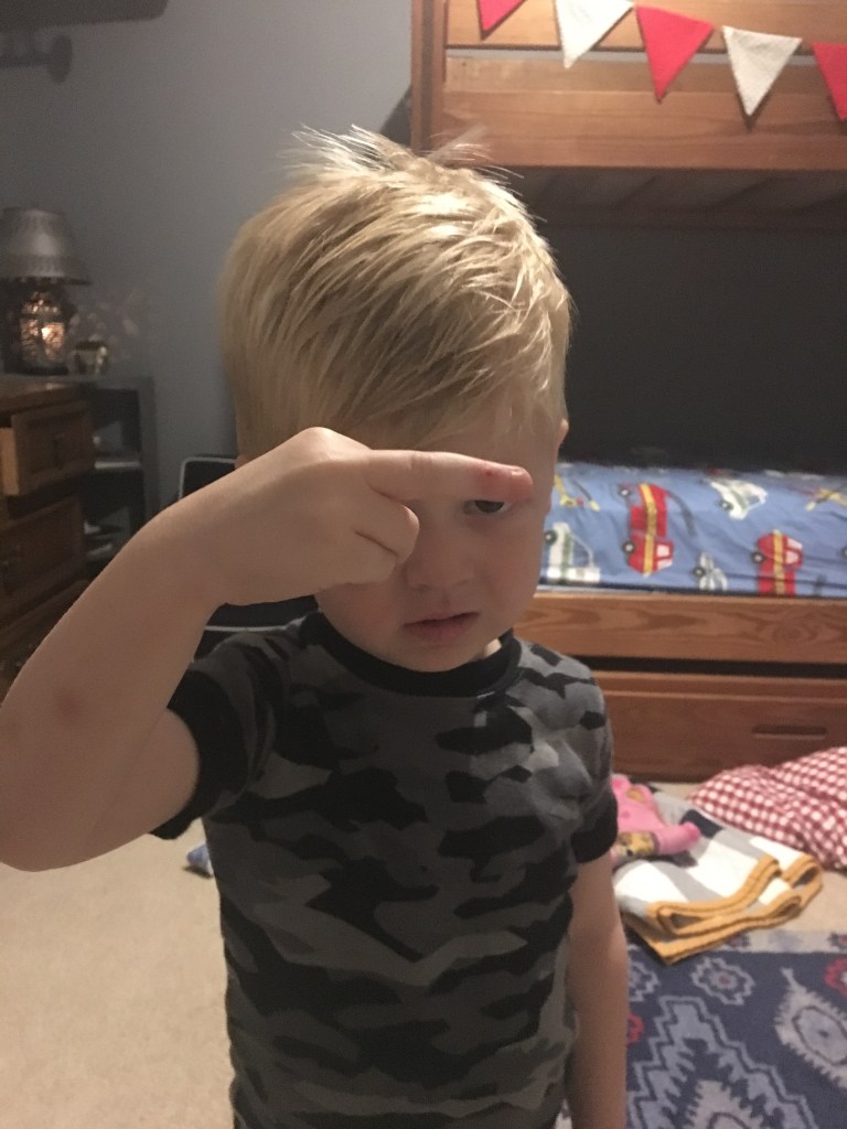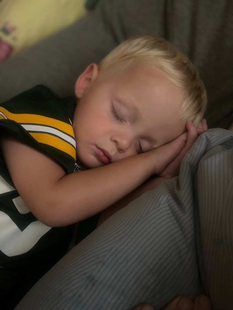 So, we bring him into bed and let him sleep in between us and I wake up at 6 am with his hand down my shirt, while Eric has long since left to sleep on the couch because Fitz won’t stop kicking him.